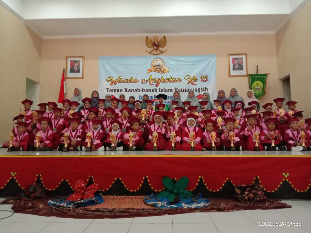 Wisuda dan pelepasan siswa TK islam Ratnaningsih Tahun Pembelajaran 2021-2022 di Aula Perkantoran Pemda II Bantul. Acara wisuda dan pelepasan di laksanakan pada Jumat, (24/6/2022). Acara tersebut di hadiri oleh 49 anak siswa yang akan di wisuda .Sejumlah anak-anak menampilkan bakat dan kemampuannya dalam acara tersebut dengan menampilkan Pentas Tari Kupu - kupu Manis dengan harapan anak-anak setelah lulus memiliki kecerdasan,ceria,berakhlak mulia berjalan aman,lancar dan sukses.